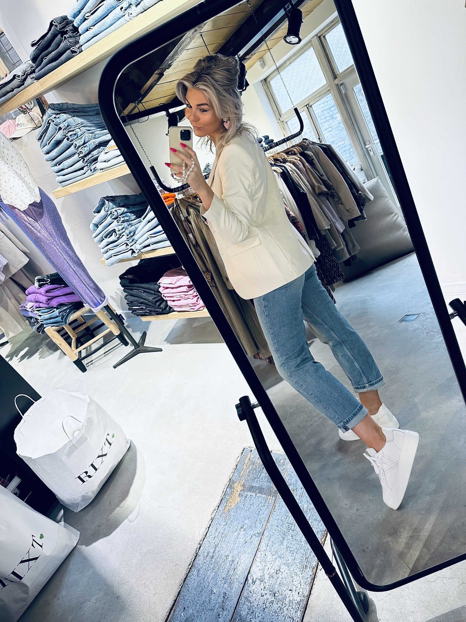 Rixt draagt maat 36 en is 177 cm.