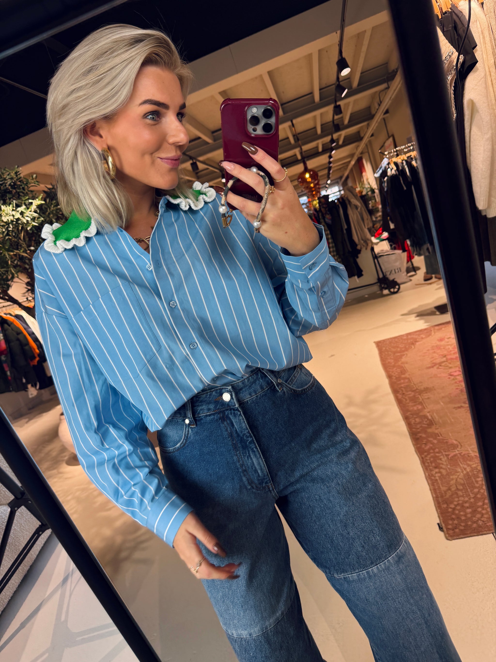 Gestreept overhemd van 100% katoen, ontworpen in een oversized silhouet met lage mouwinzet. Het heeft een knoopsluiting aan de voorkant, een borstzak en een afgeronde zoom. Een contrasterende gehaakte kraag met volantdetails maakt het ontwerp compleet.