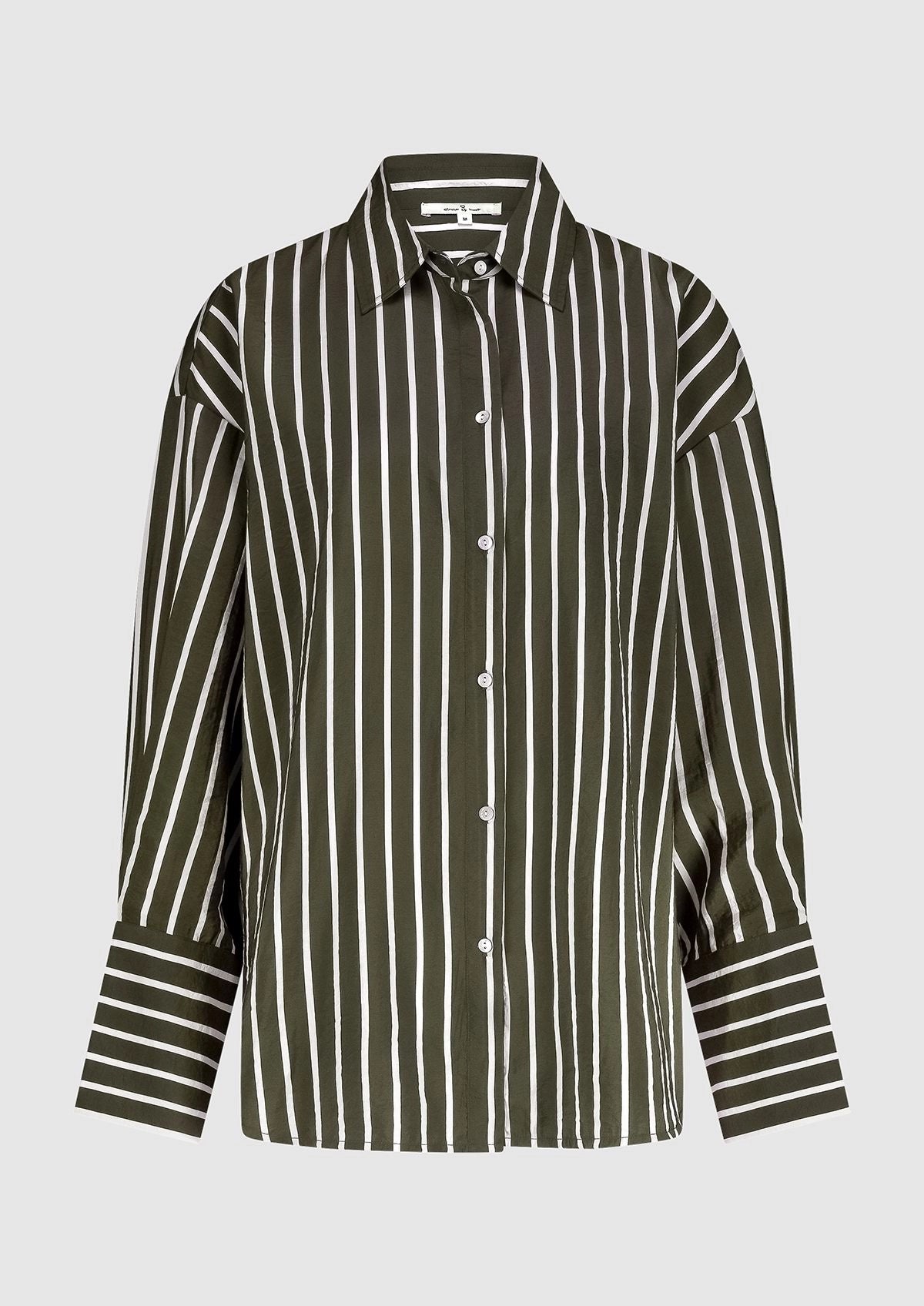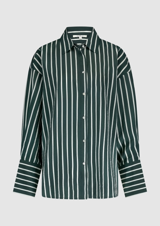 Luchtige petrolgroene dames blouse met verticale witte strepen. De Opal blouse heeft een oversized fit met een knoopsluiting en een langere achterkant.