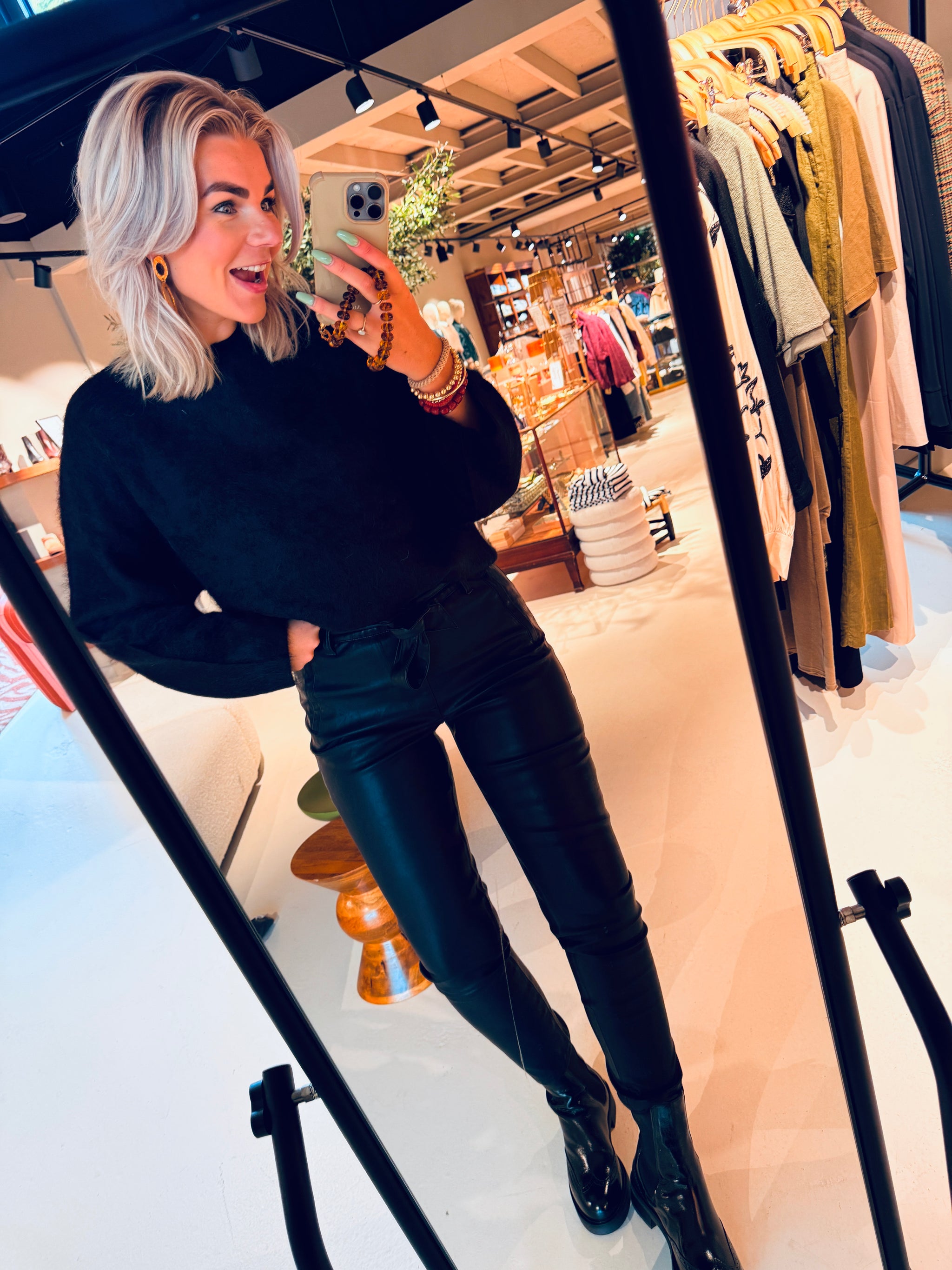 De Francis-broek heeft een hoge taille, taps toelopende pijpen en een geplooide tailleband met een afneembare riem die je taille accentueert, waardoor dit de perfecte broek is. Haar imitatieleren look voegt een vleugje verfijning toe aan elke outfit, zodat je overal opvalt.