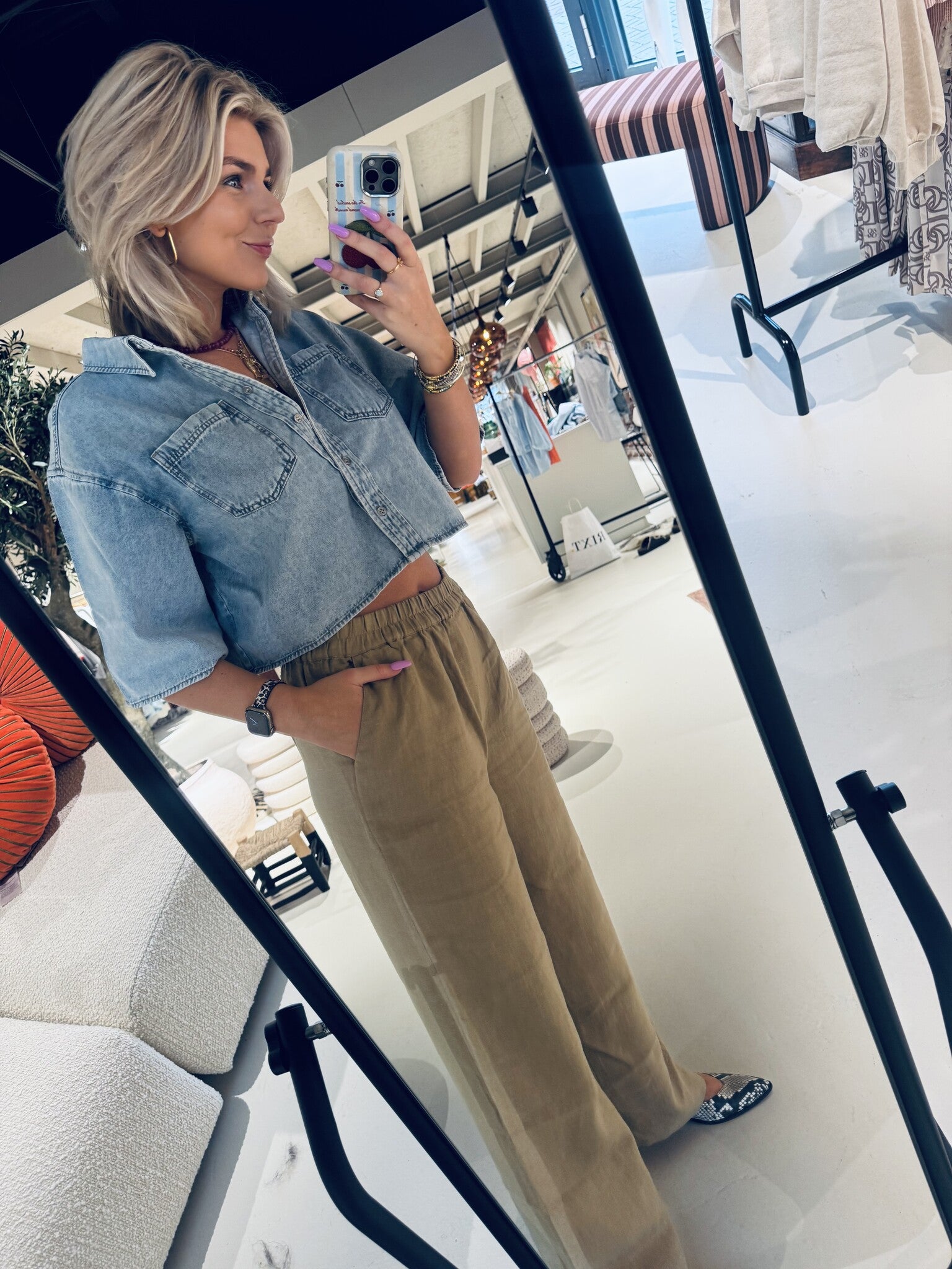 Luchtige linnen dames broek met wijde broekspijpen uitgevoerd in khaki. De Lyra pants heeft een elastische tailleband, steekzakken en een zakje aan de achterzijde.
