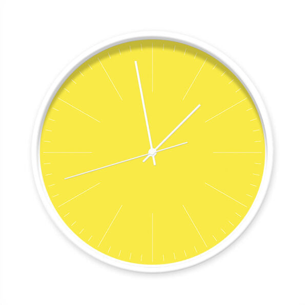 Trendy minimalistische gele wandklok met fijne witte streepjes voor de tijdsaanduiding. Mooi in een kleurrijk en fris interieur. Heel fijn: de klok is geluidloos en tikt dus niet.