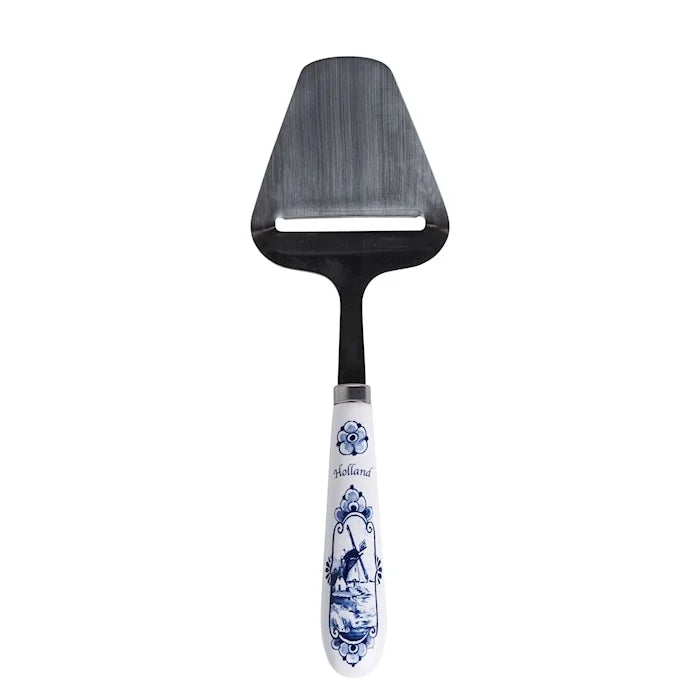 Deze handige kaasschaaf is ideaal om een lekkere plak kaas af te snijden. Het handvat is gemaakt van keramiek en gedecoreerd met een Delfts blauwe molen aan de waterkant.