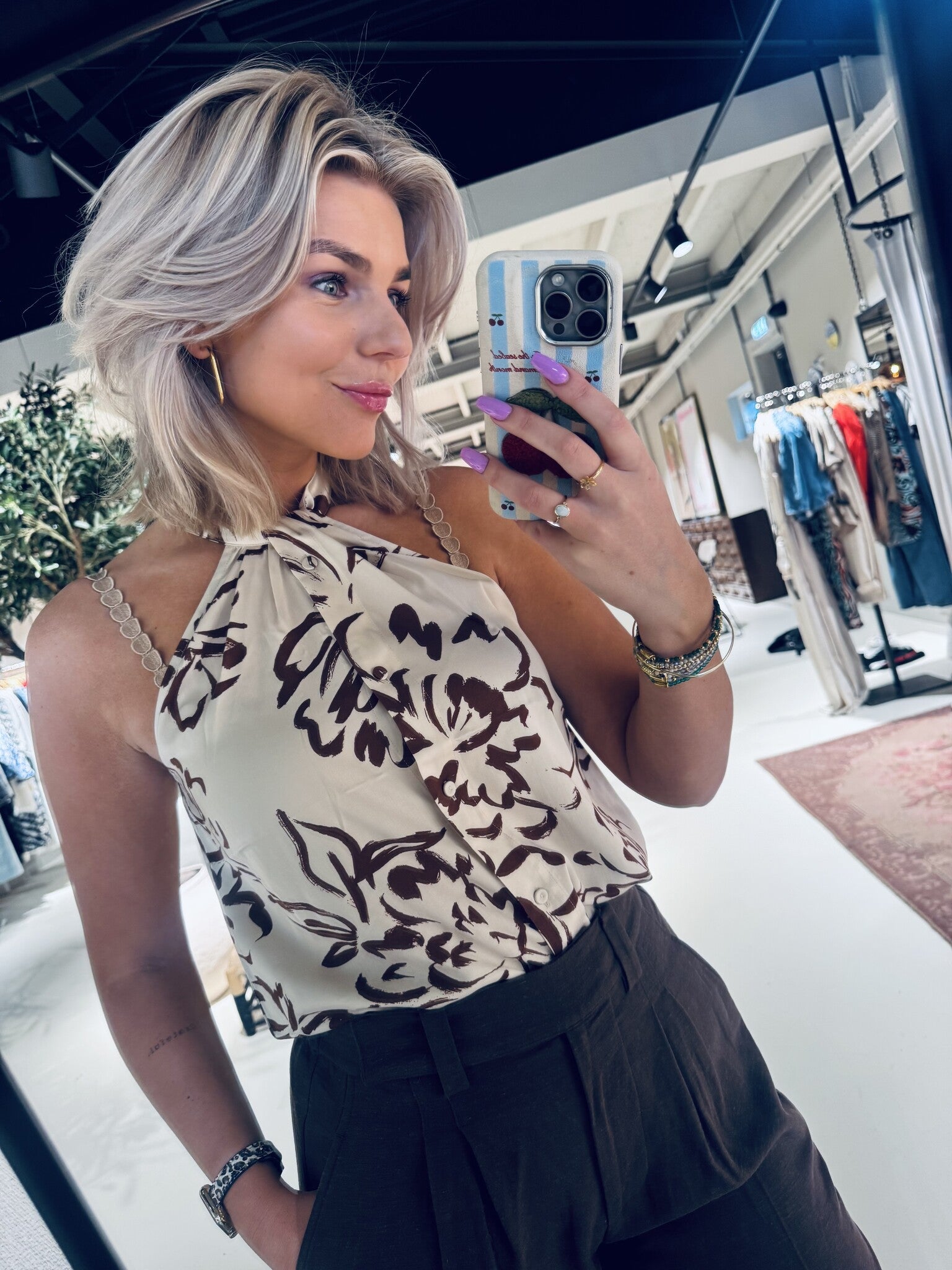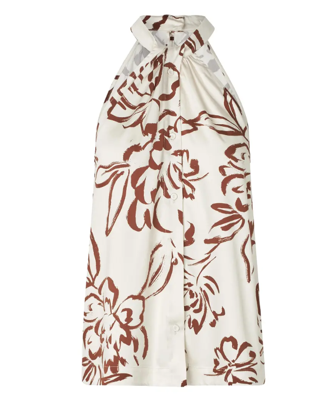 Second Female top met grafische print. De top is gemaakt van een zachte en gedrapeerde viscosemix. Met een doorknoopsluiting aan de voorkant en een keyhole-opening aan de achterkant met knoopsluiting. Halternek en diep uitgesneden armen. Regelmatig, vloeiend model.