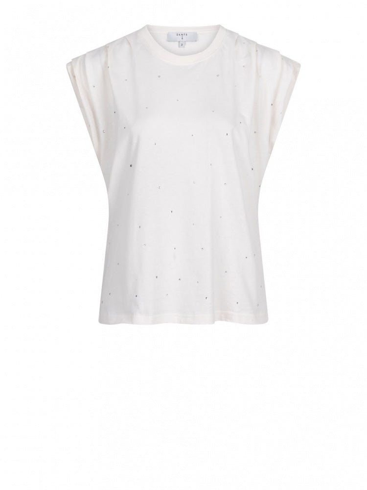 Kies voor het nieuwe T-shirt Idety in de crème kleur Butter Cream. De top is gemaakt van 100% katoen en is versierd met strassteentjes. De top heeft plooien bij de schoudernaad, waardoor een sterk silhouet ontstaat. Dit T-shirt is perfect om dagelijks te dragen en mag niet ontbreken in je garderobe.