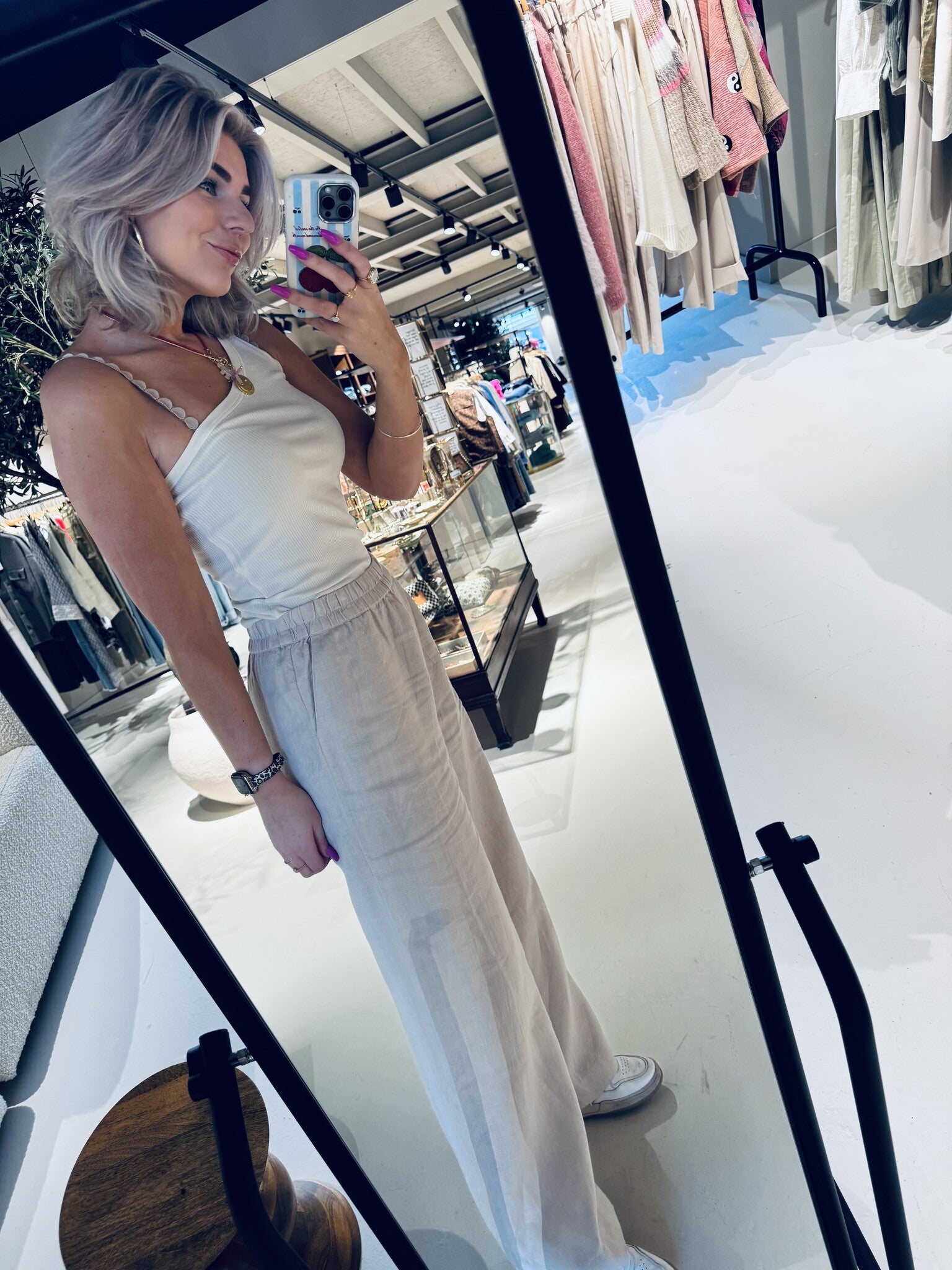Luchtige linnen dames broek met wijde broekspijpen. De Lyra pants heeft een elastische tailleband, steekzakken en een zakje aan de achterzijde.