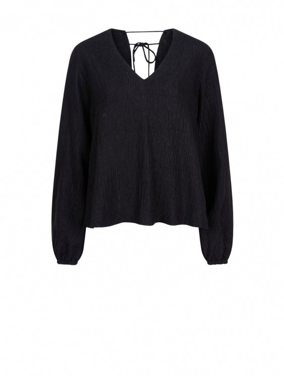 De top Stardom in zwart wordt snel je nieuwe favoriet. De eenvoudige, comfortabele pasvorm gecombineerd met het mooie materiaal maakt deze top uniek. Hij heeft een V-hals met striksluiting aan de achterkant. De mouwen zijn los gesneden met elastische manchetten