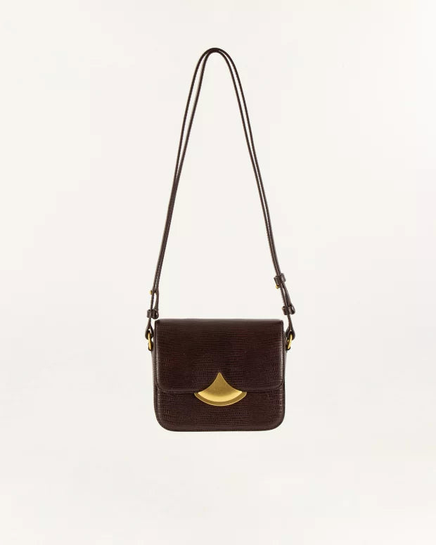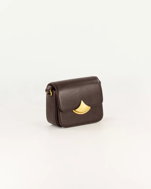 Kleine box tas met twee compartimenten en een magnetische sluiting in rundsleder met hagedisprint. Exclusief door Sessùn ontwikkeld ontwerp.