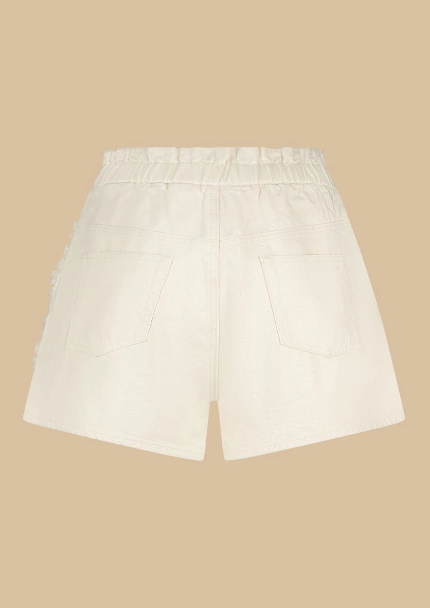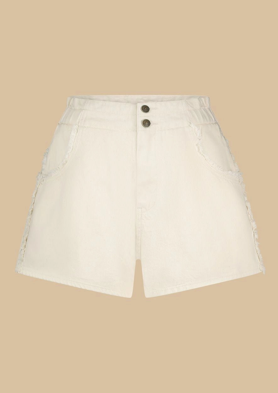 Loose fit dames short uitgevoerd in een gebroken witte tint. De Jodie short heeft een gulp met ritssluiting, een elastische tailleband met steekzakken aan de voorkant en ook zakken aan de achterzijde. De short is afgewerkt met rafels.