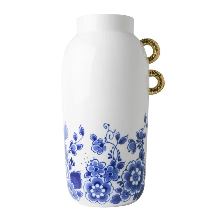 Deze opvallende vaas is onderdeel van de Goud Oortje collectie. Terwijl de onderkant rijk versierd is met Delfts blauwe bloesem, is de bovenkant prachtig wit. De gouden oortjes die beiden aan één zijde geplaatst zijn, steken subtiel af tegen het witte porselein en geven de vaas een eigentijdse look. De Goud Oortje vazen zijn ontworpen door Debbie Wijskamp voor Heinen Delfts Blauw. Op een speelse manier brengt zij een minimalistische en een maximalistische wereld met elkaar in verbinding. Bonte texturen, kleuren en stijlen smelten samen op een sobere en eenvoudige manier.