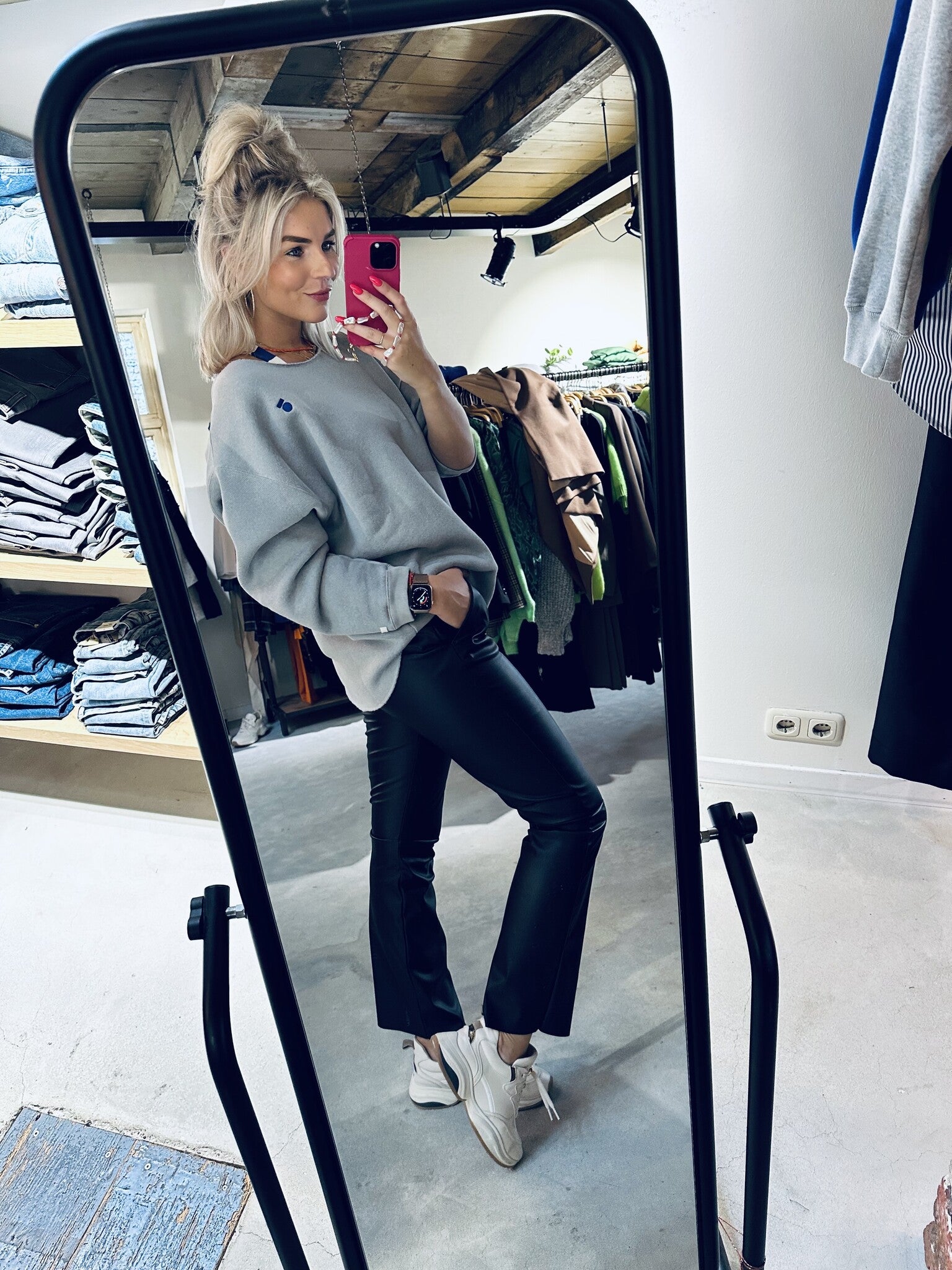 Regular fit cropped jogger in lederlook. Voorzien van een elastische tailleband, steekzakken, een fake achterzak, raw edge broekspijpen en een mini stripes logo borduring onder de linker voorzak.