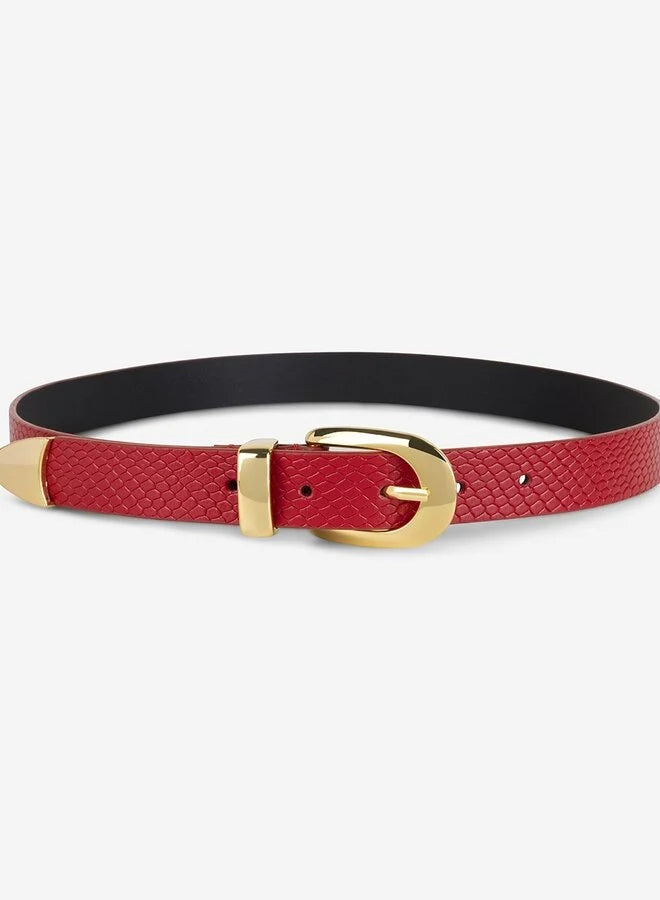 Voeg kleur toe aan je outfit met de Amara Belt in Barbados Cherry. Deze riem is gemaakt van hoogwaardig leer en afgewerkt met een gouden gesp en mooi reliëf. De perfecte finishing touch voor jouw favoriete jurken of broeken. Verkrijgbaar in maten S (75 cm), M (85 cm) en L (95 cm).