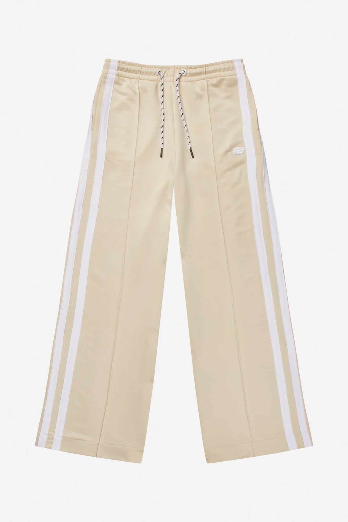 Deze broek heeft een rechte, relaxte pasvorm met een elastische tailleband en verstelbaar trekkoord. Hij is afgewerkt met opvallende strepen aan de zijkant, vouwen aan de voorkant en een klein geborduurd logo. Een sportief ontwerp dat geschikt is voor dagelijks gebruik of meer gestileerde looks.
